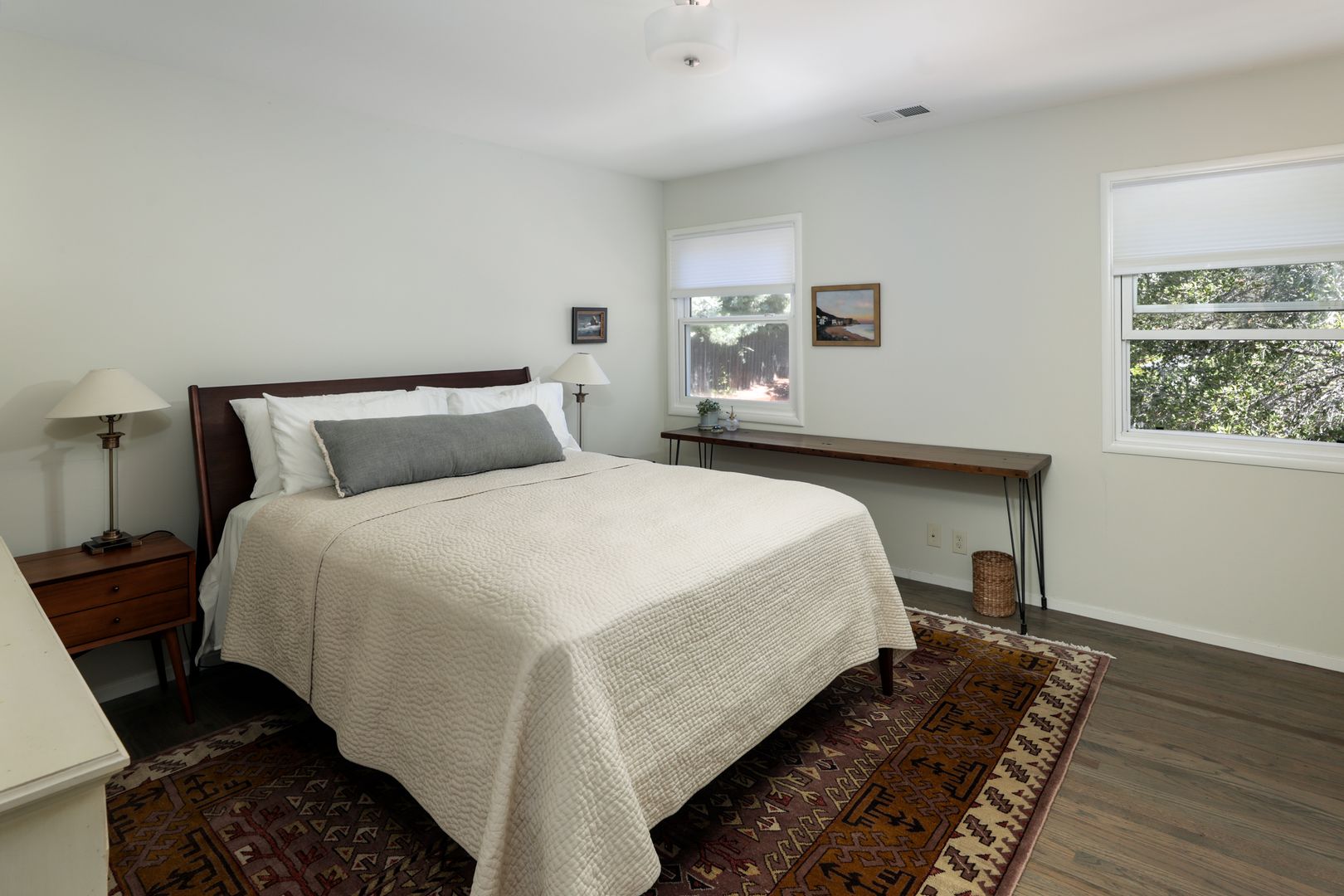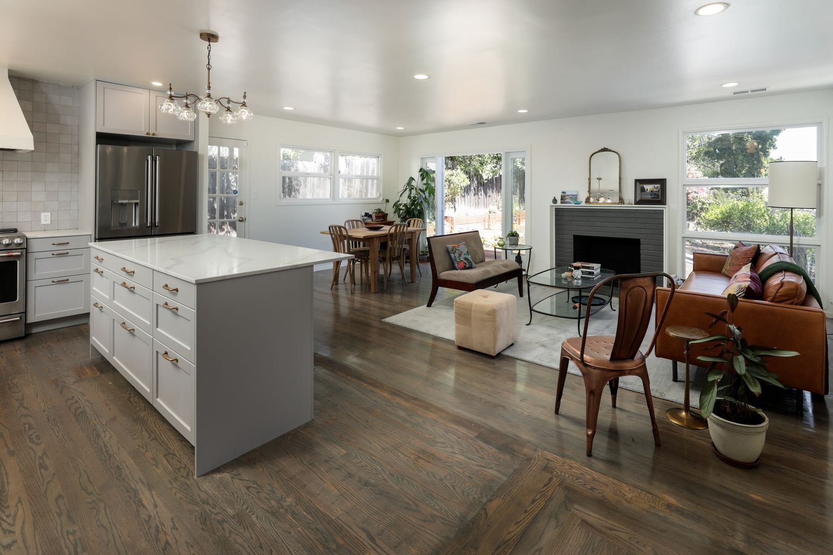 Light and bright living room /dining room opens to a tranquil backyard. Spacious, updated kitchen with large island completes this open floorplan. Up a few steps you will find 3 good size bedrooms and two full baths including a primary suite. Oversized garage with shelves for storage. Laundry area, which included a washer/dryer, in the garage. Garage also opens to backyard. Enjoy the backyard which offers many fruit trees, room for your own garden and lots of privacy. Gardener included. No pets. Unfurnished. One year lease. 6 month lease followed by month to month might be considered.